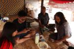 Kami sempat mencoba belajar menenun dan alhasil pinggang pun sakit karena harus duduk tegak dan mengandalkan kekuatan pinggang. Sedangkan tangan harus lentur di pergelangan dan menghentakkan alat tenun dengan lembut namun kuat. Semakin rumit saja bagi kami orang awam ini. Semakin kagum pula kami akan kehebatan masyarakat desa ini. Kain yang mungkin keliatan sepele namun dikerjakan helai demi helai dengan penuh keuletan dan ketelatenan. Luar biasa!