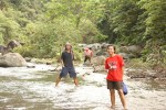 Keesokan harinya, ketika matahari mulai keluar menuju peraduannya kami pun bersiap-siap untuk tracking ke Air Terjun. Perjalanan ditempuh hampir satu jam, mulai dari melewati keindahan hutan hujan tropis, menyeberang sungai, mendaki bukit kecil, dan tentu saja yang paling menantang adalah digigit lintah. Jenis lintahnya adalah lintah jarum yang kecil-kecil. Akhirnya sampai juga kami ke air terjun yang dimaksud. Hal yang pertama dilihat mata dan yang terpikirkan hanya satu kata “WOW”. Indah sekali air terjun Tiu Teja. Surga indah yang tersembunyi. Belum banyak masyarakat yang tahu akan lokasi air terjun ini. Kami bisa sampai ke tempat ini berkat bantuan dari teman-teman pendamping kami yang luar biasa tangguh dan tangkas.